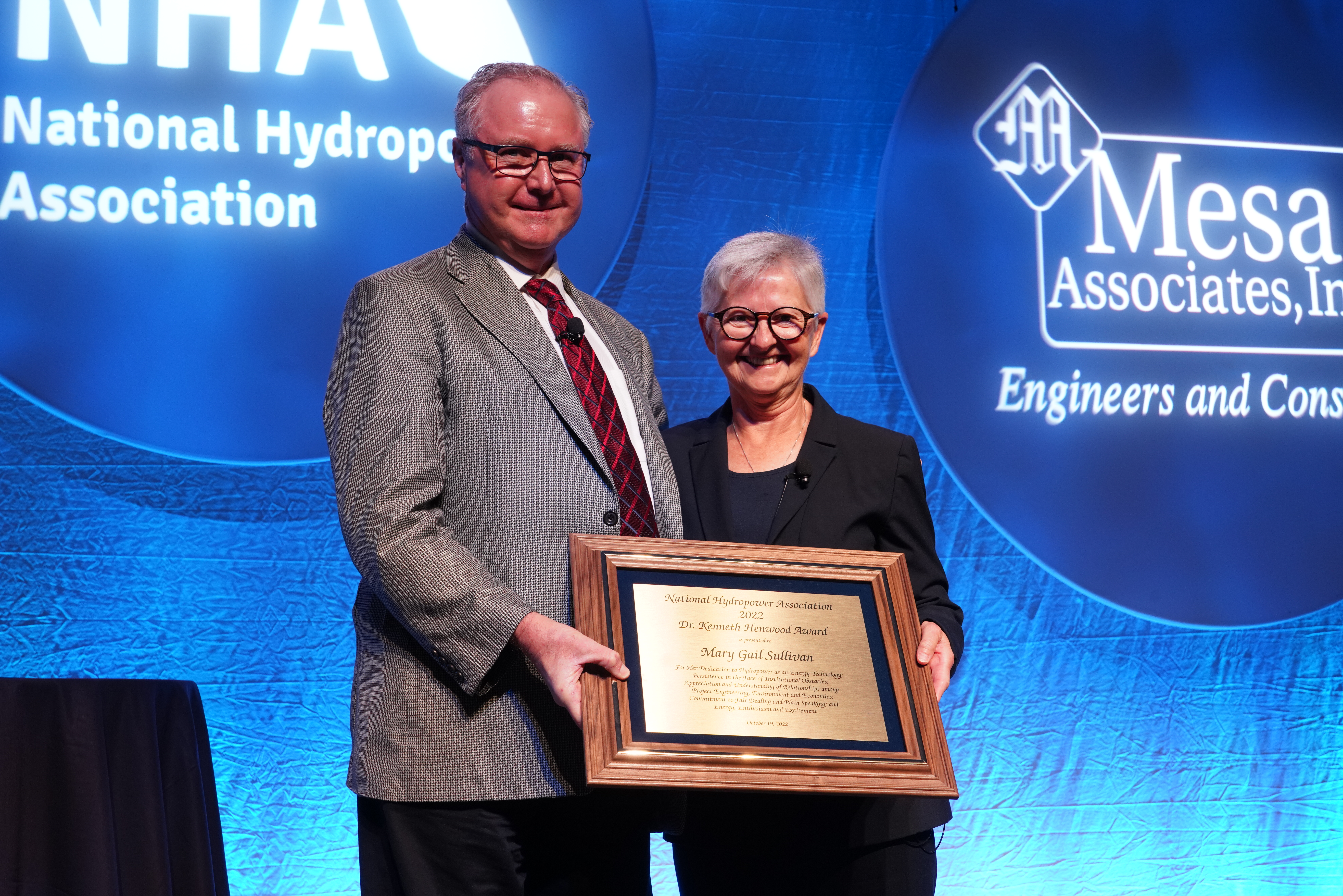 HDR Senior Vice President Renewable Energy Service Richard Millers presents NorthWestern Energy Director Environmental & Lands Permitting & Compliance Mary Gail Sullivan with the National Hydropower Association’s Dr. Kenneth Henwood Award, the industry’s highest honor.