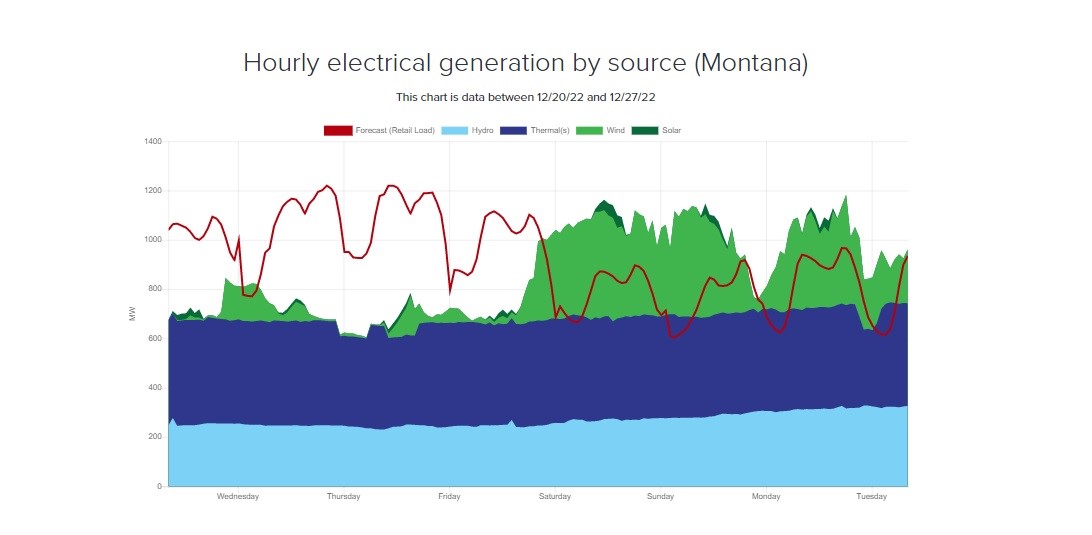 The chart above shows the source of NorthWestern Energy’s energy generation from Dec. 20 – 27, 2022, with the red line showing the forecast of how much power is needed to meet demand. When generation doesn’t meet demand, additional electricity from the market is purchased. When generation exceeds demand, extra energy can be sold on the market, with profits benefitting our Montana customers.
